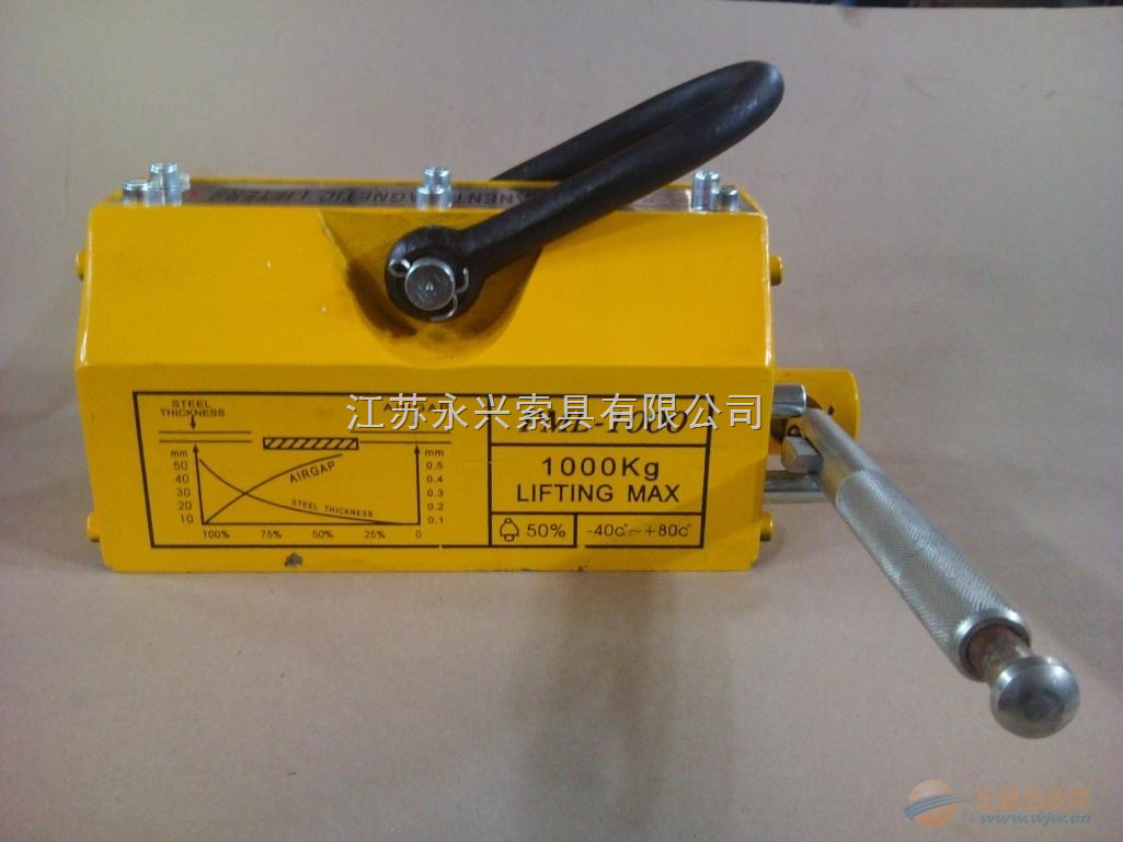永磁吸盘又名磁力吸盘或永磁起重器,是机械厂,模具厂,锻造厂,炼钢厂,造船厂等等使用钢材场所的*搬运工具,可以大大提高块状,圆柱状,板材,不规则导磁性钢铁材料的搬运效率。永兴索具公司的永磁吸盘是以高性能的稀土材料钕铁硼(N>40)为内核,通过手扳动吸盘手柄转动,从而改变吸盘内部钕铁硼的磁力系统,达到对需要搬运的工件的吸持或释放。