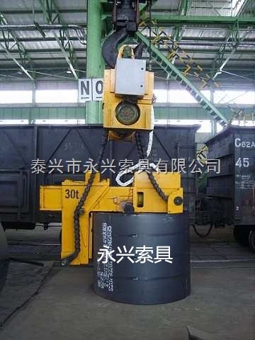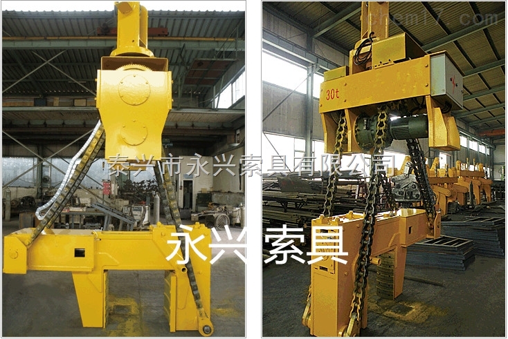将夹钳外侧的钳腿插入到卷板的中心孔中,启动夹紧电机,将卷板夹牢。吊起卷板后启动翻转电机,通过传导装置带动夹钳钳腿和卷板转动,到另一个工位自动停止。夹钳翻转作业可在吊车运行中进行。