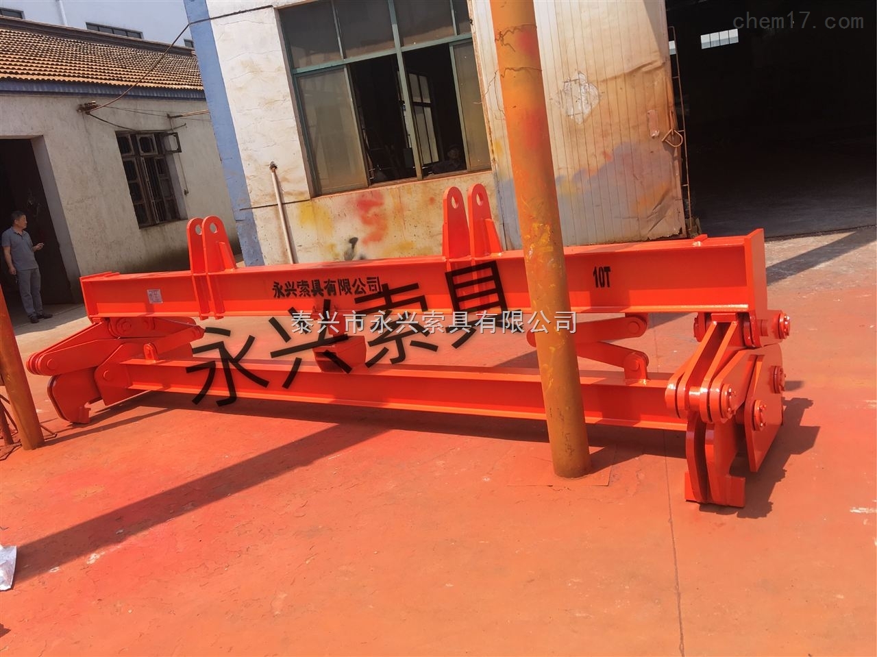 吊梁:吊梁是与天车钩相连的部件,有吊环卸扣式联接、吊索具式联接和吊耳式联接三种结构。吊环卸扣式联接吊轴,使吊具的受力情况改善,同时也避免了装卸钢坯时的脱钩现象,降低了夹具本身的高度,有利于低矮的场所使用。吊索具式联接吊轴,使夹具的受力较好,但吊具自身的高度大,需在高大的场所使用,在挂吊钩时需用人工进行辅助挂钩。吊耳式联接吊轴,可由吊车司机直接挂钩, 但在吊装作业时需使吊具着地,并下放吊钩直至不受力为止,这样,易导致吊车钩脱钩。