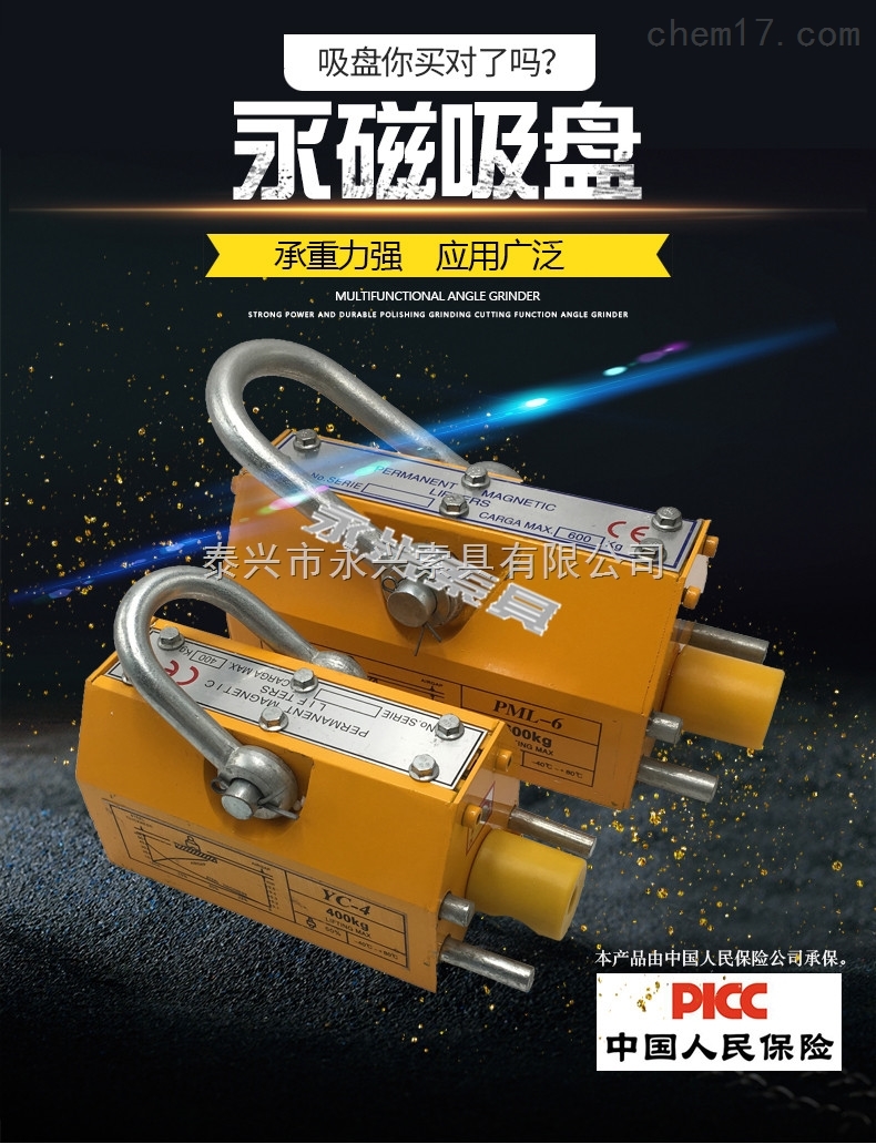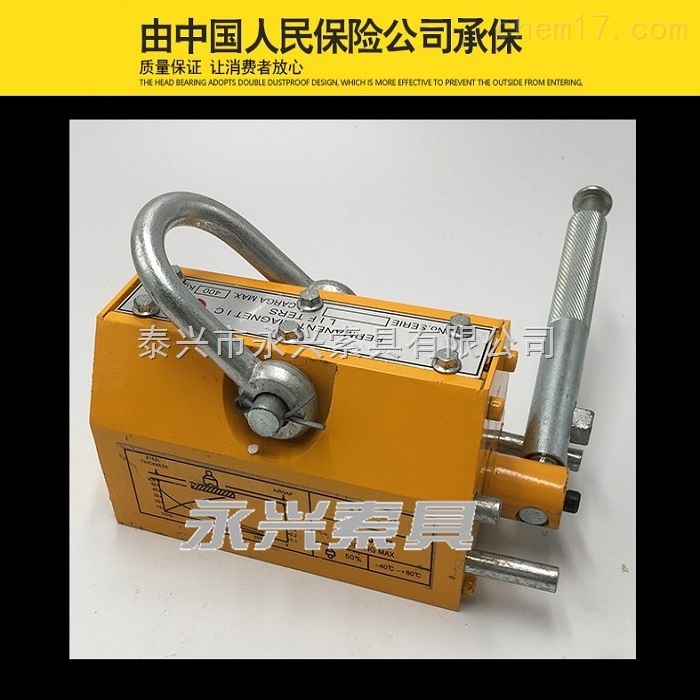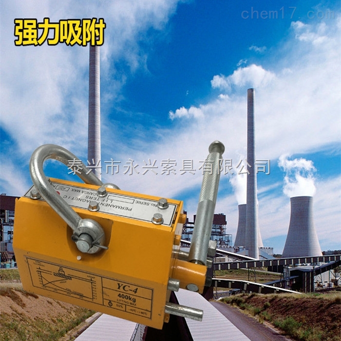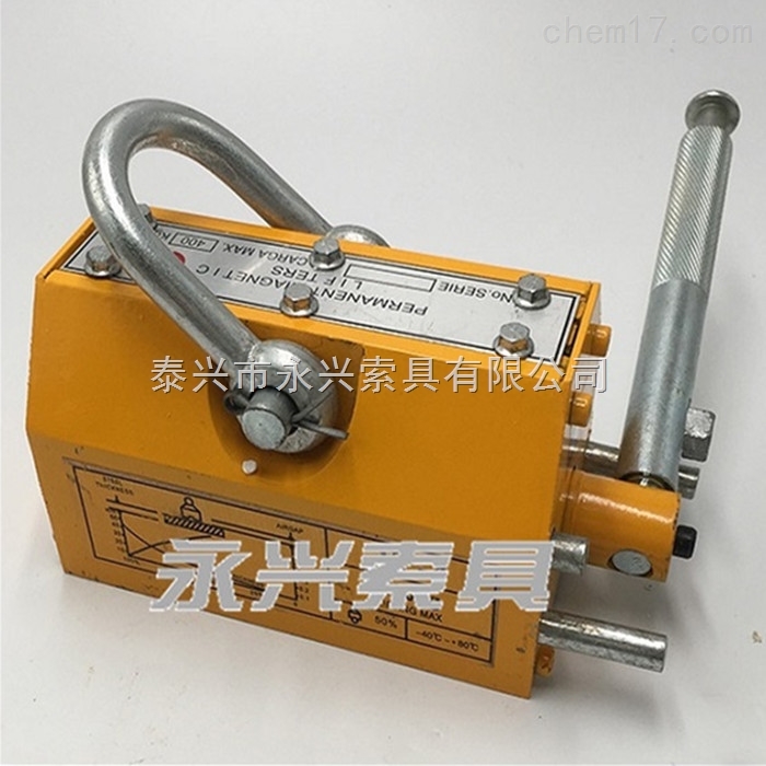 永磁吸盘又名磁力吸盘或永磁起重器,是机械厂,模具厂,锻造厂,炼钢厂,造船厂等等使用钢材场所的*搬运工具,可以大大提高块状,圆柱状,板材,不规则导磁性钢铁材料的搬运效率。永兴索具公司的永磁吸盘是以高性能的稀土材料钕铁硼(N>40)为内核,通过手扳动吸盘手柄转动,从而改变吸盘内部钕铁硼的磁力系统,达到对需要搬运的工件的吸持或释放。