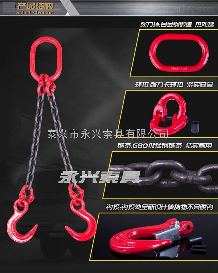 永腾牌单叉链条吊具由泰兴永兴索具有限公司提供,公司主要生产柔性吊带、扁平吊装带、复合吊装绳成套索具、高强纤维吊装带、钢丝绳吊具、复合钢丝绳吊具、特种钢丝绳吊具、橡胶复合钢丝绳吊具、尼龙复合钢丝绳吊具、环形柔性吊带、两头扣柔性吊带、环眼柔性吊带、双扣加保护柔性吊带、起重链条成套索具、引纸绳、注塑绳、软梯、安全带等几大系列,欢迎新老客户、来函洽谈订购!